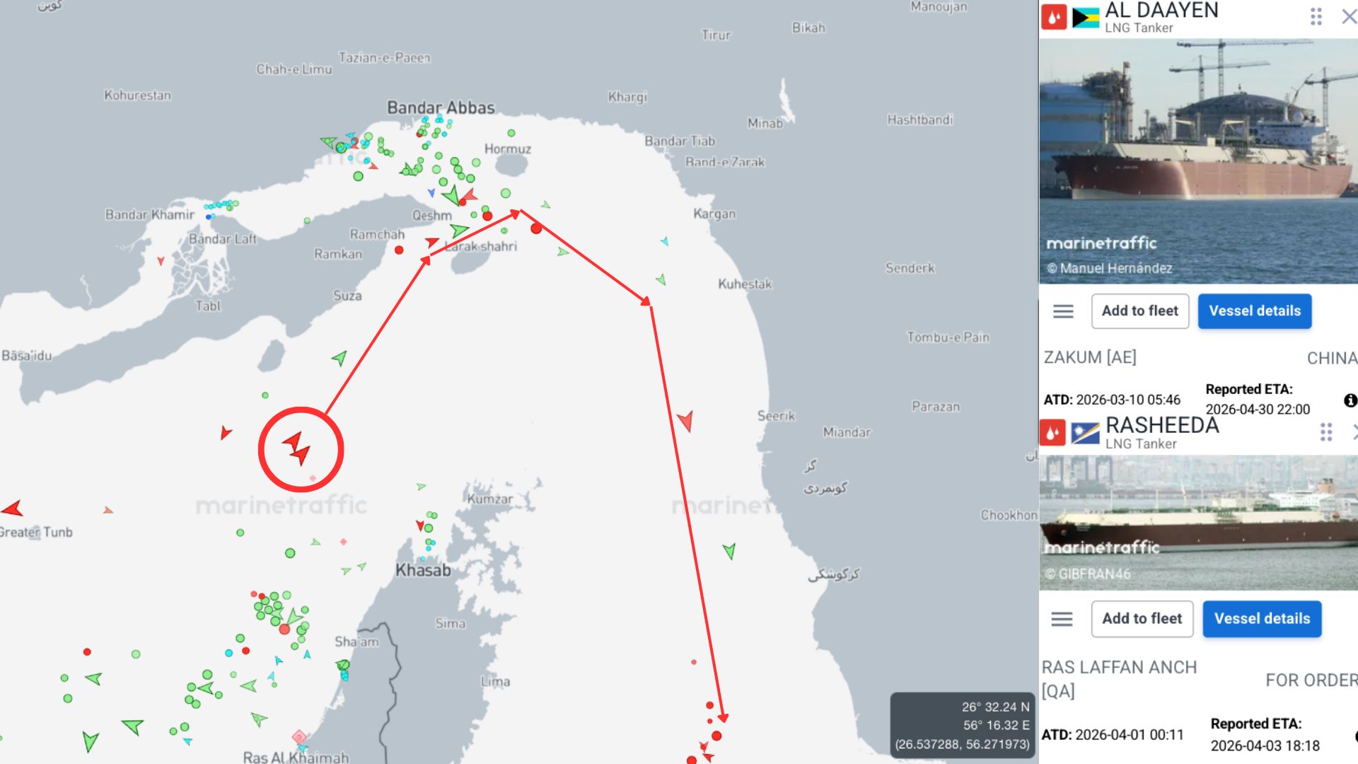 The Al Daayen and Rasheeda, which each loaded LNG from Qatar’s export plant in late-February, were moving eastward toward the opening of the strait near Oman 🚨. The vessels had been idling in the Gulf as the war escalated and Hormuz remained largely closed to shipping.
