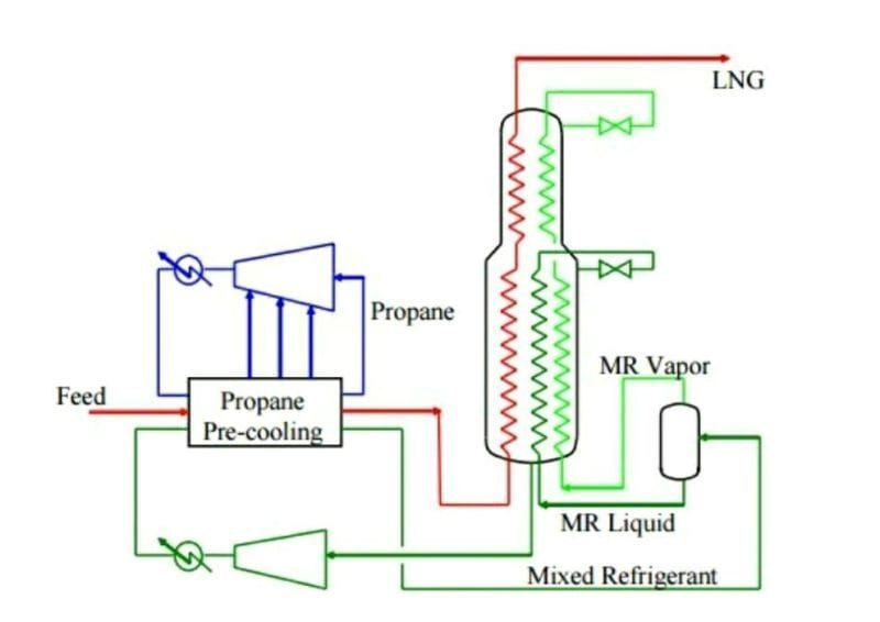 3️⃣ Pre-cooled Mixed Refrigerant process - this process is generally known as the MCR process 👉 Multi-Component Refrigerant and is a combination of the pure refrigerant cascade and mixed refrigerant cycles.